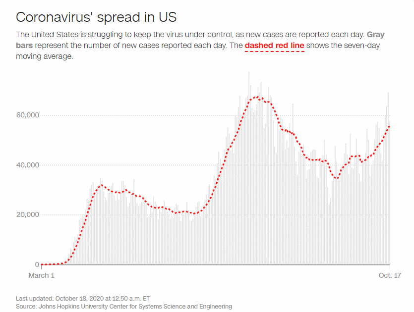 美国有线电视新闻网(CNN)10月18日报道称,16日,美国新增至少6.9万例新冠肺炎确诊病例,这是自7月以来单日新增病例最多的一天。专家称,这标志着美国秋冬季疫情开始暴发。